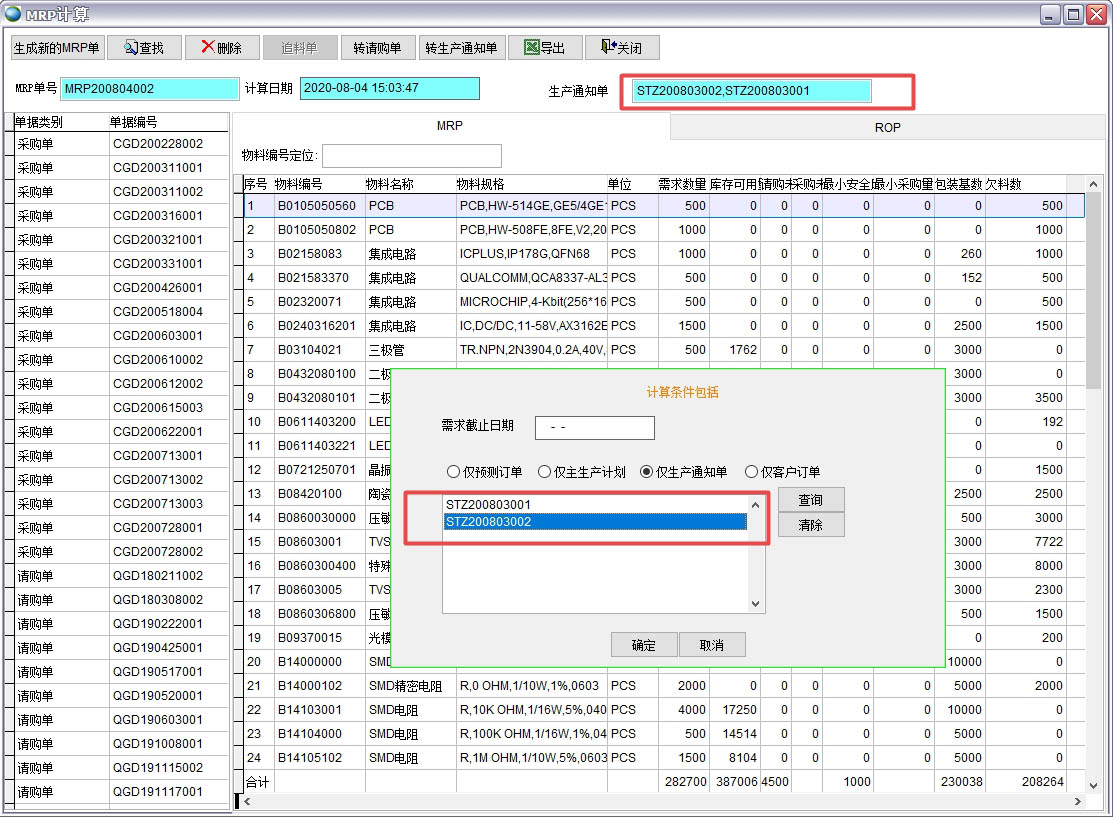 左邊表格是所有參與計(jì)算的單據(jù),右邊表格是物料的需求