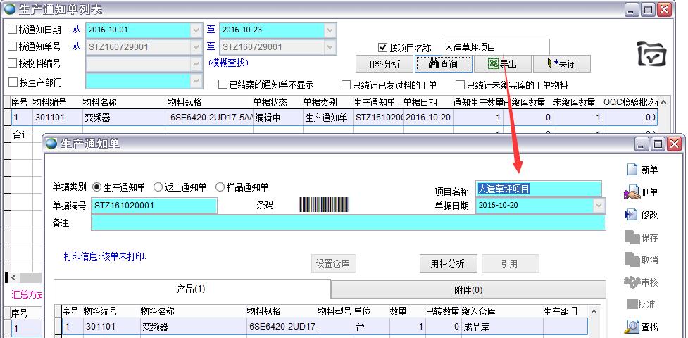 雙擊通知單號(hào)可以打開該生產(chǎn)通知單。