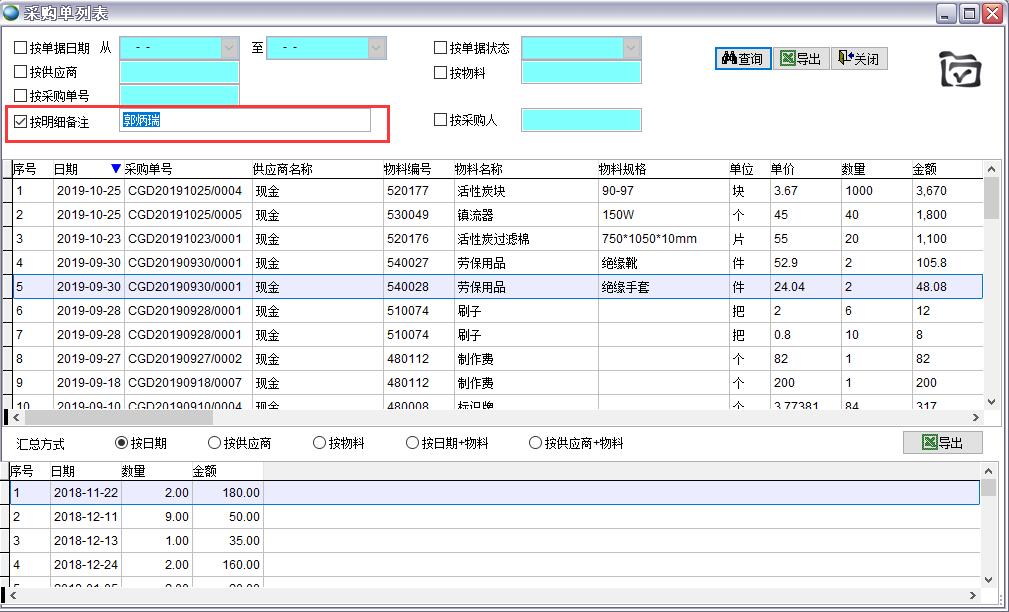 可以按物料編號、物料名稱、物料規(guī)格模糊查詢