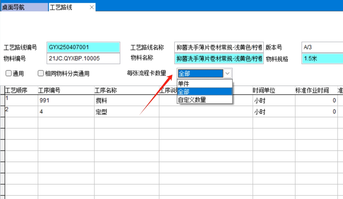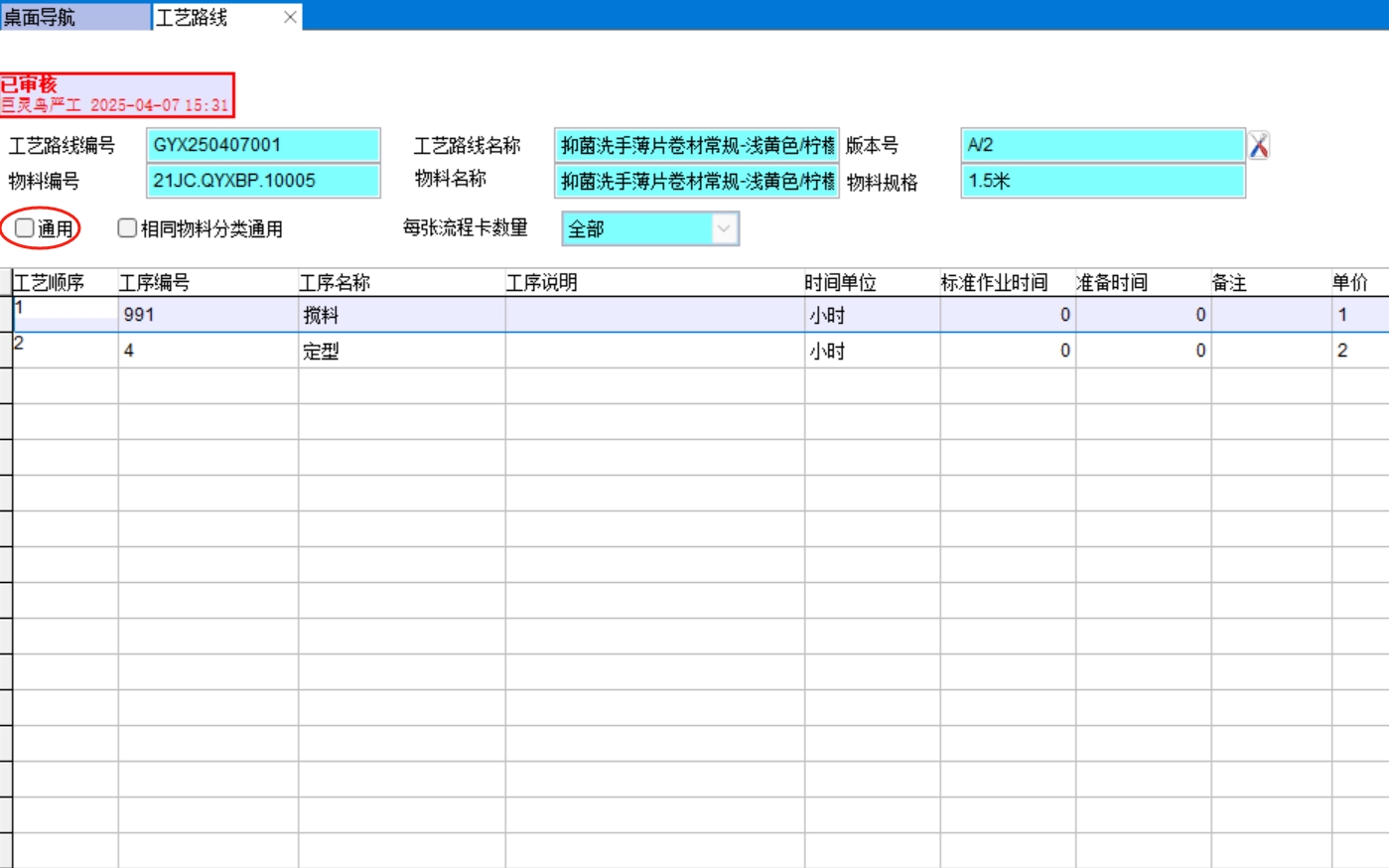 勾選了通用后就不要建多個工藝路線了,只要建一個工藝路線