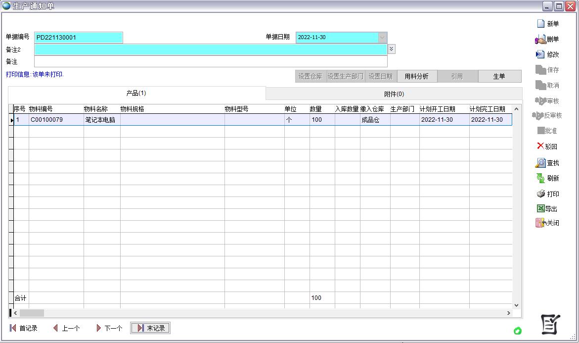 2、做生產(chǎn)通知單,生產(chǎn)100臺電腦