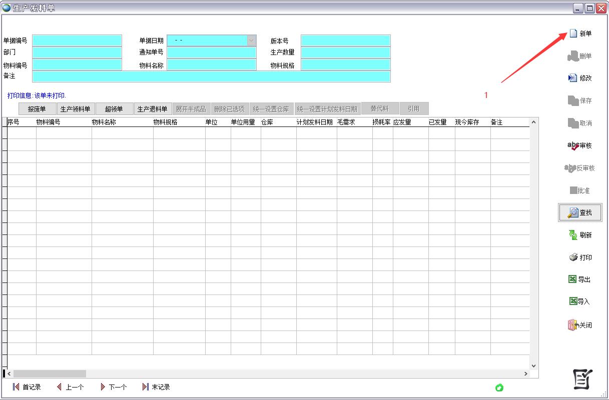 打開路徑:【主菜單】->【計劃】->【生產(chǎn)發(fā)料單】