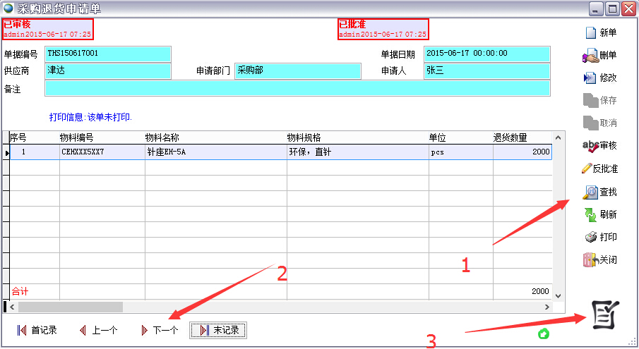 采購?fù)素浬暾垎螢槭止ば略,錄入供?yīng)商及物料所對應(yīng)的編碼生成單據(jù)。采購?fù)素浬暾垎蔚南嚓P(guān)信息會關(guān)聯(lián)到供應(yīng)商交退貨記錄表中。