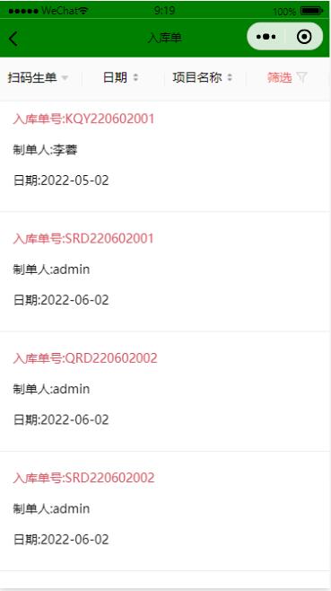 入庫單對(duì)應(yīng)ERP中的各種入庫單,如采購入庫單、成品入庫單、其它入庫單、庫存調(diào)整單等,數(shù)據(jù)在ERP中錄入,同步到微信小程序端