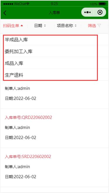 如果商品(包括產(chǎn)成品、半成品、原材料)使用了一維碼、二維碼、流程卡的,可以使用微信小程序掃碼生成入庫單,數(shù)據(jù)會(huì)反向同步到ERP。