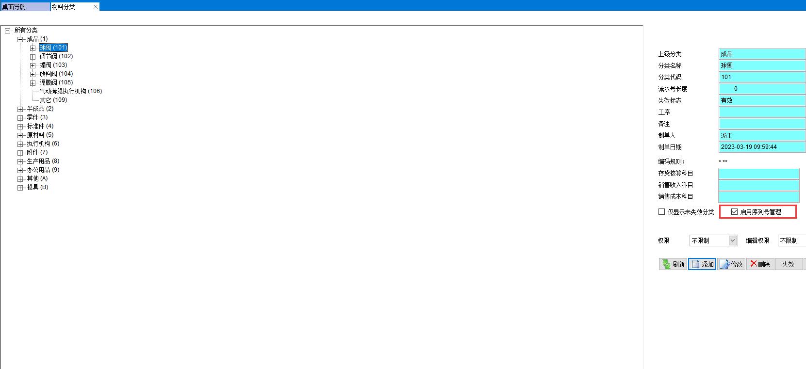 在物料分類上啟用序列號管理,可以對同一類別的物料統(tǒng)一設(shè)置序列號管理