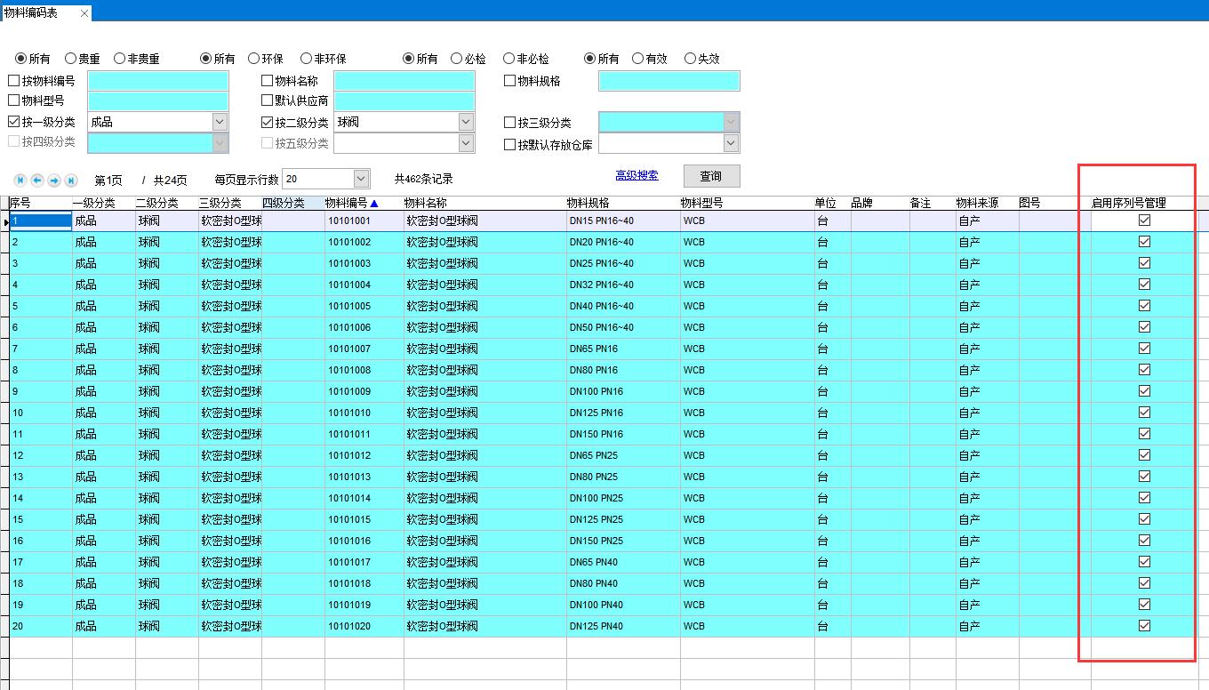 在物料編碼表中可以看到該分類所有物料都已經(jīng)啟用序列號管理
