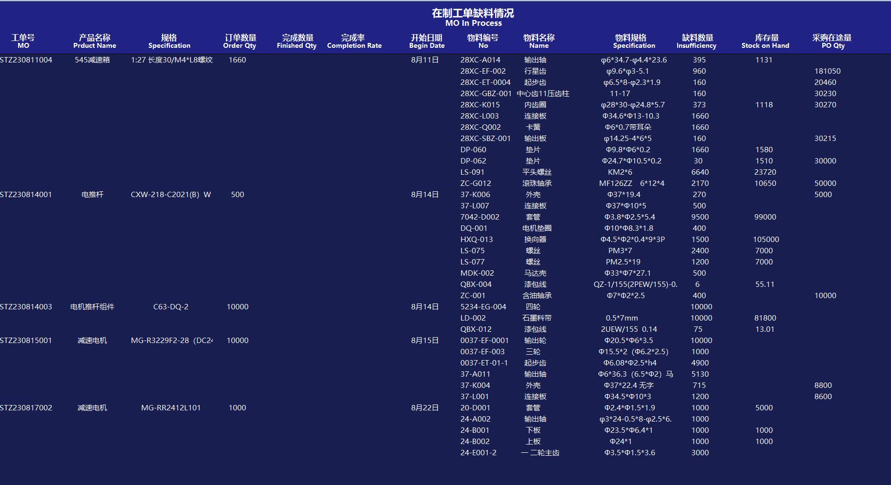 生產(chǎn)工單缺料看板給車間管理人員、倉管員、采購員直觀了解近期排產(chǎn)工單的缺料情況,講停工待料的風(fēng)險降低到最小程度