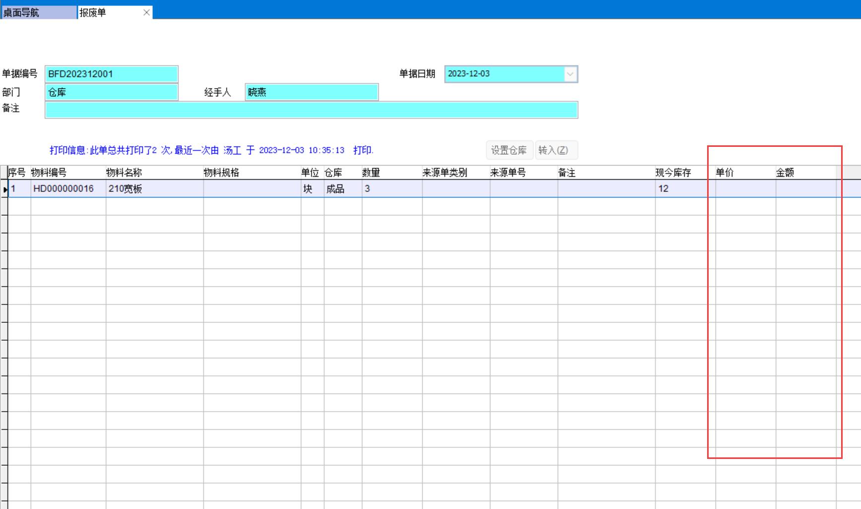如果有庫存金額,則需要填寫單價和金額,單價和金額默認(rèn)不顯示,在表體布局中設(shè)置