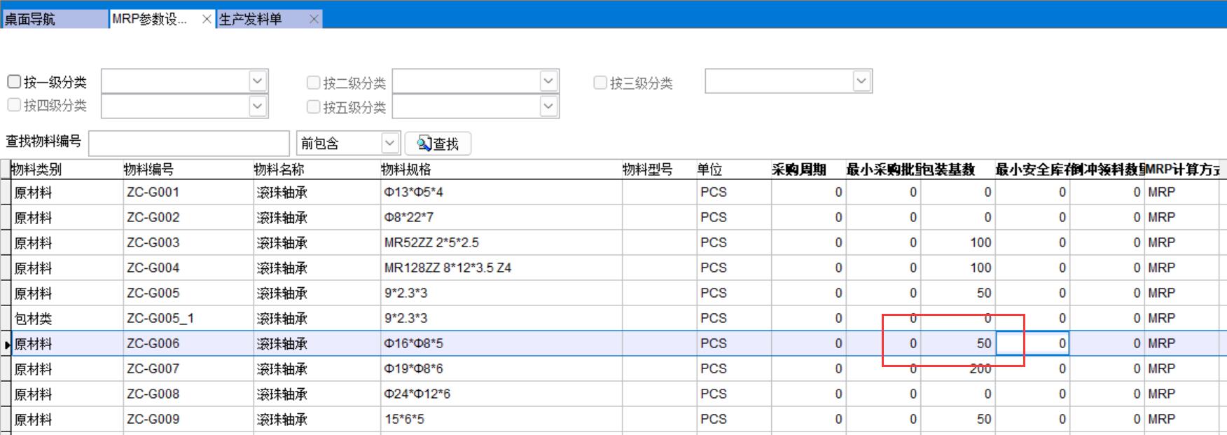 1、設(shè)置包裝基數(shù)(或倒沖數(shù)量都可以),如下圖,這個滾珠軸承包裝基數(shù)50