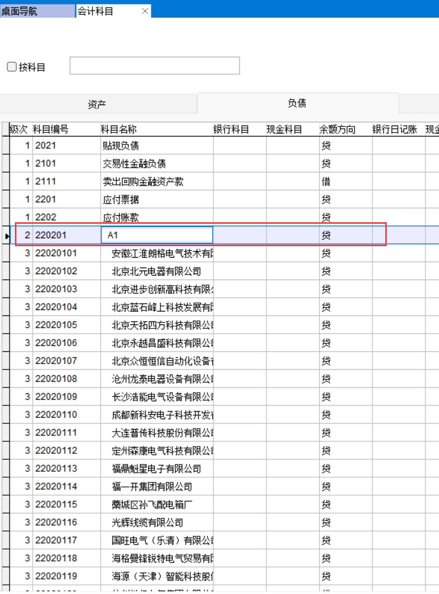 為什么是應付賬款的三級科目而不是二級科目呢?因為每級科目用兩位數(shù)表示的,最多只有99個。因此二級科目是一個虛擬的科目用A1、A2、A3....表示,A1下面會有99個三級科目,超過了自動歸到A2下面
