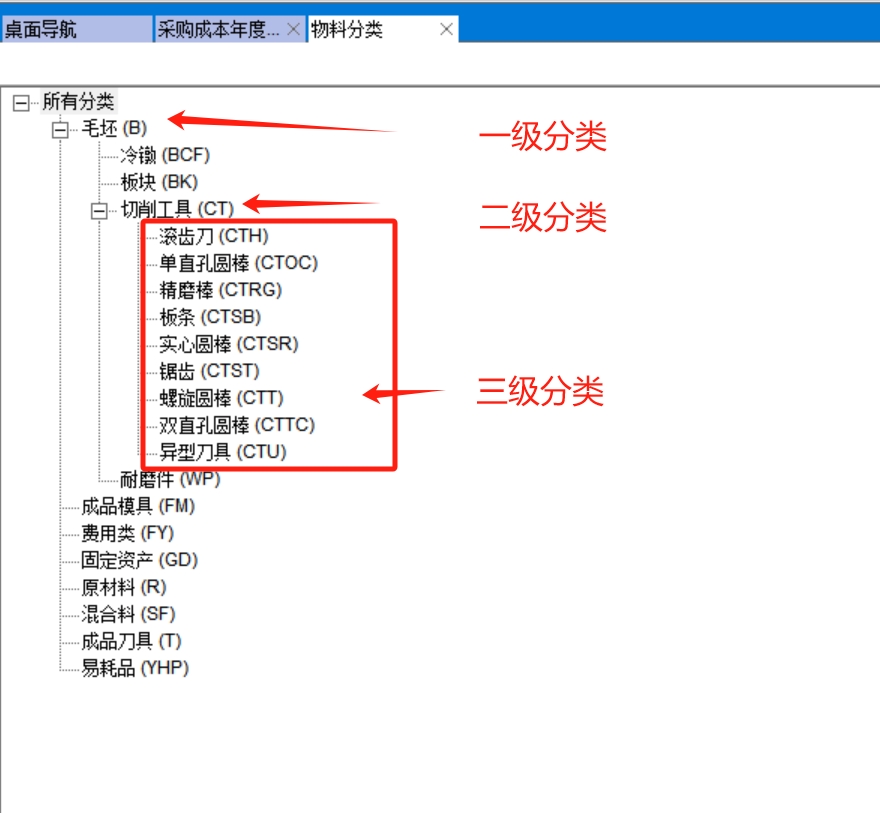 在物料分類中可以看到三級分類