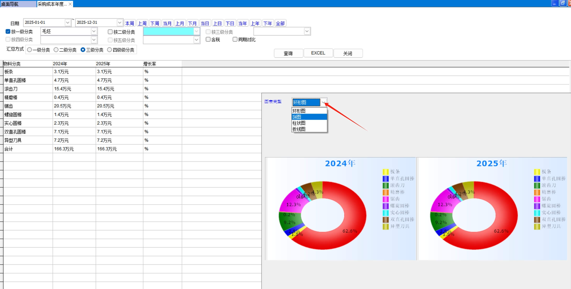 統(tǒng)計數據來源于采購單,按物料的分類對比今年和去年的采購金額。