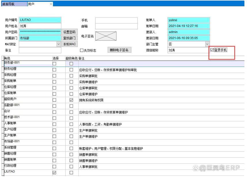 所有單據(jù)都可以設置權限,權限在電腦端設置,比如設置某用戶允許登錄手機端