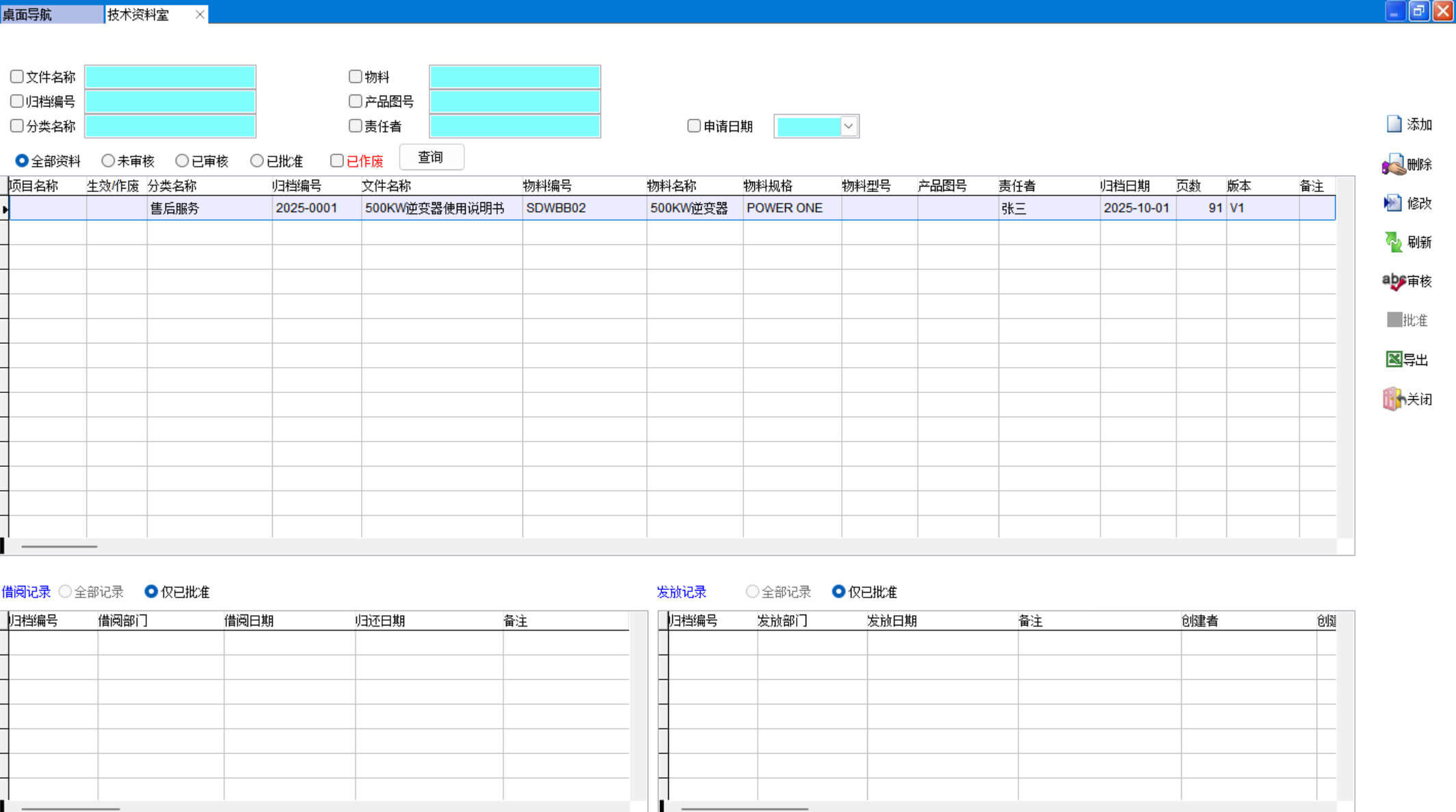 用于對技術(shù)資料進(jìn)行檔案化管理,包括分類、歸檔、借閱發(fā)放、作廢。