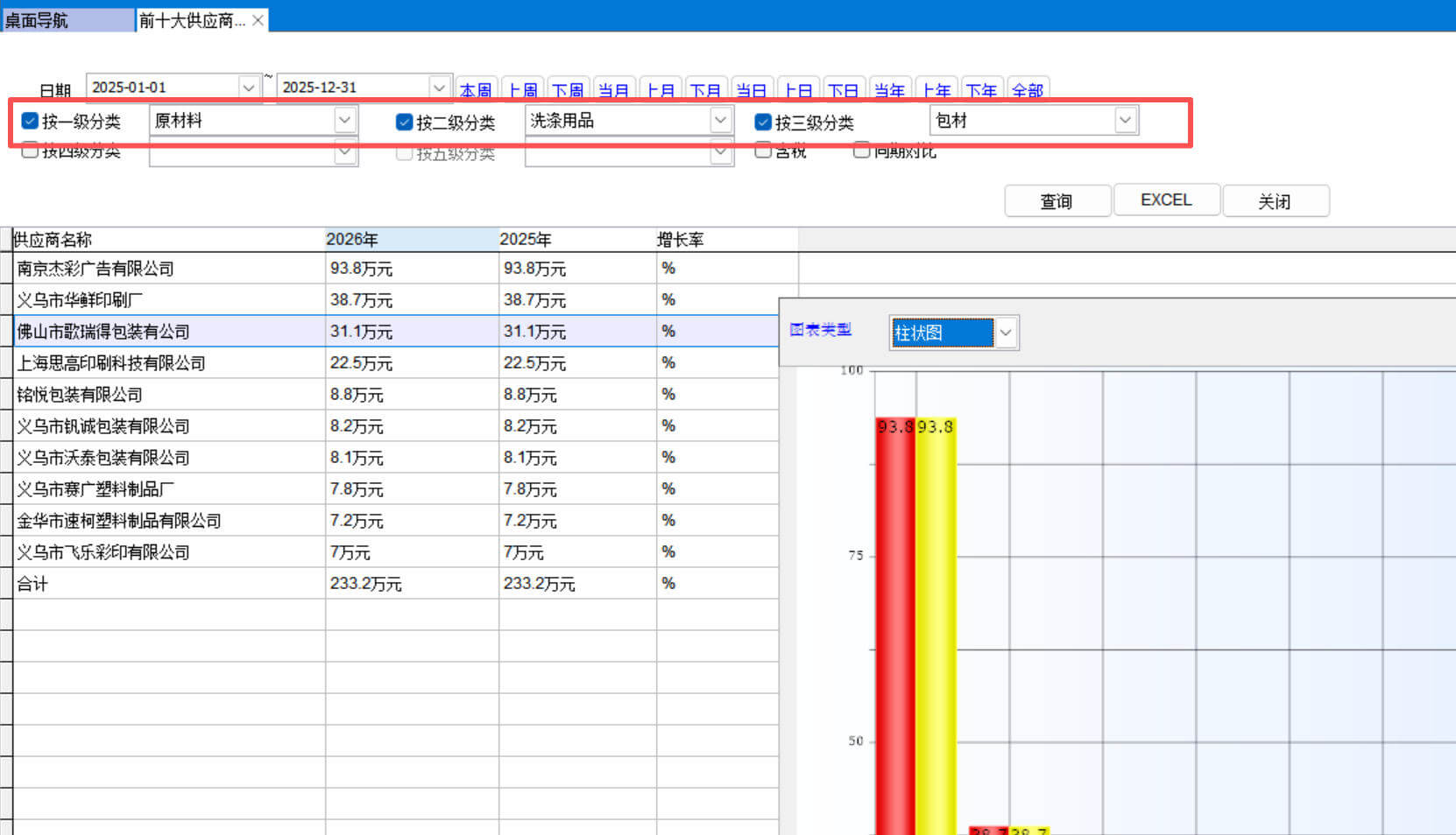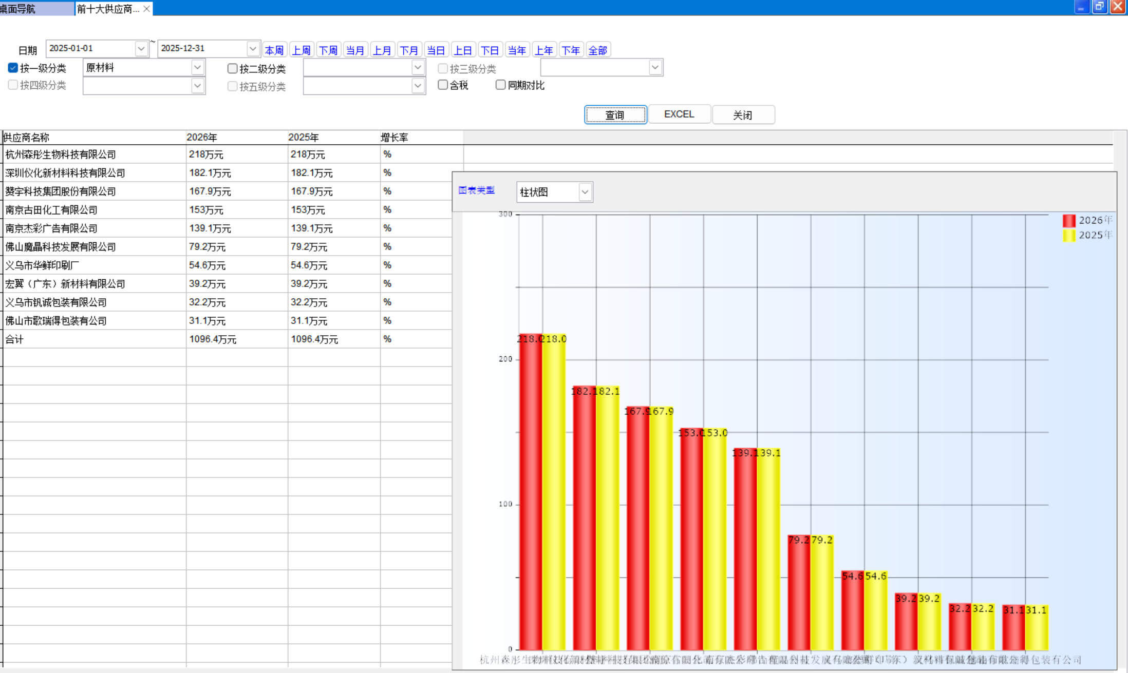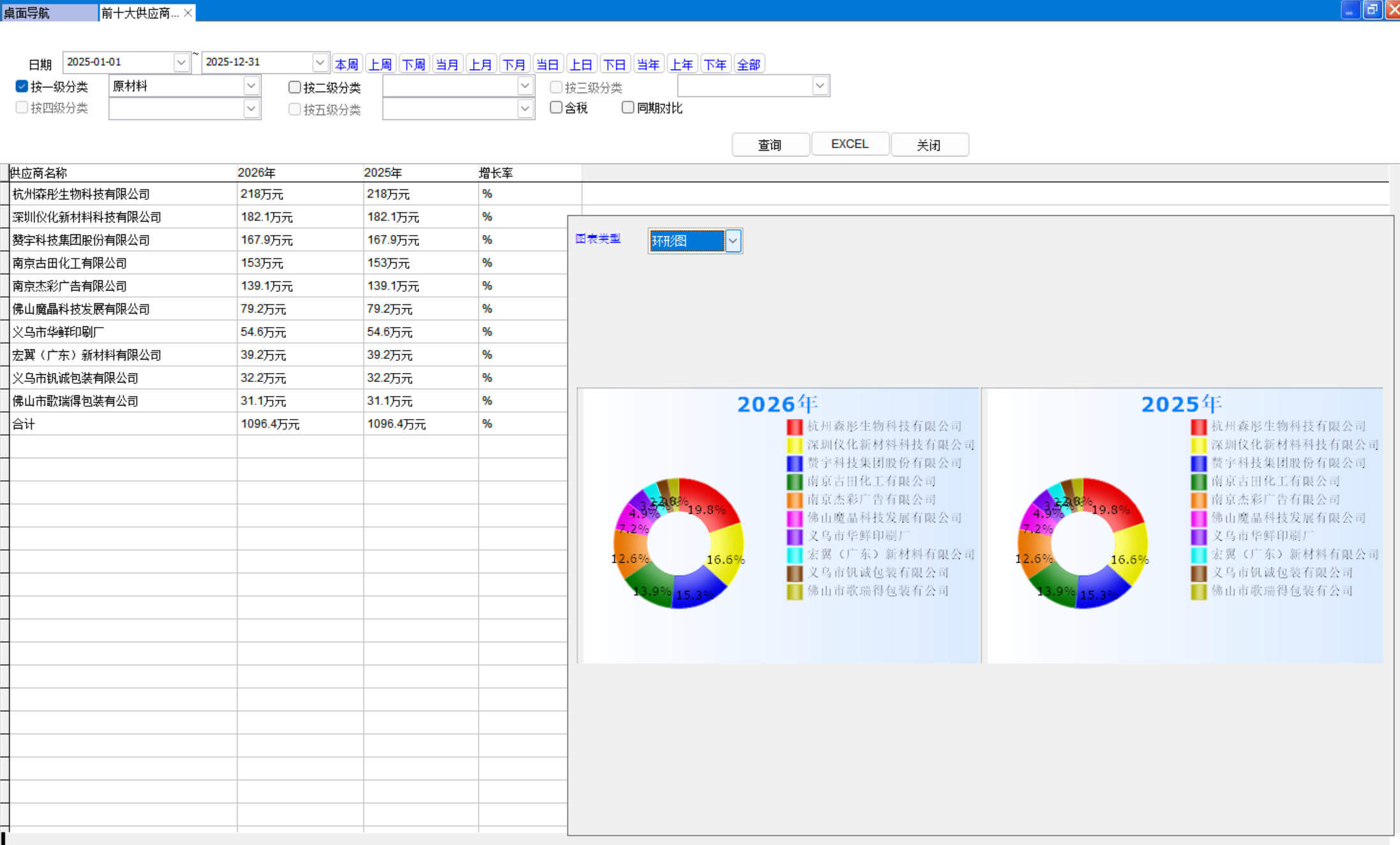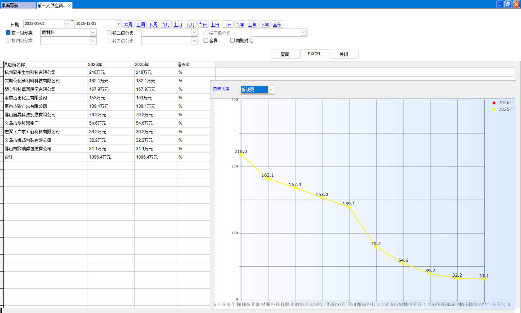 前十大供應(yīng)商是統(tǒng)計當(dāng)前和上年采購訂單金額前十大的對比統(tǒng)計表