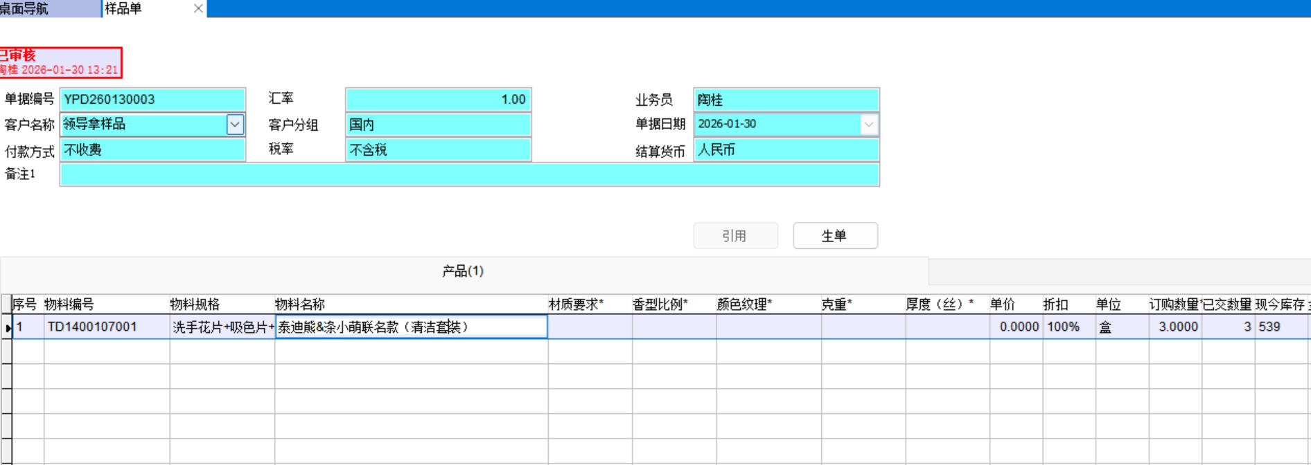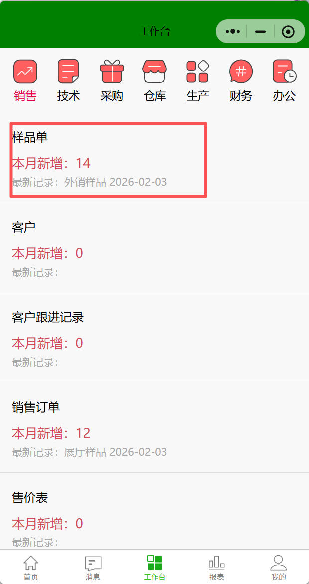 打開路徑:【首頁】-【工作臺】-【銷售】-【樣品單】