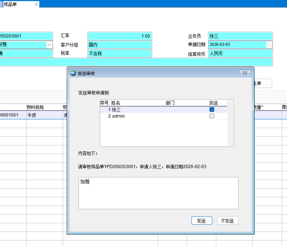 樣品單保存后發(fā)送審批人