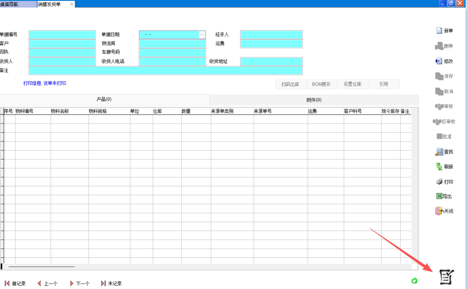 打開(kāi)路徑:【主菜單】-【倉(cāng)庫(kù)】-【出庫(kù)單】-【銷售發(fā)貨單】-右下角