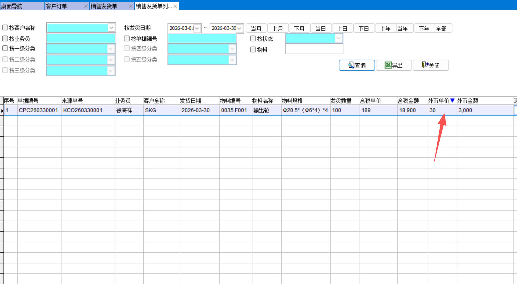 如果客戶訂單是美元訂單,在銷售發(fā)貨單列表可以顯示外幣單價(jià)、外幣金額
