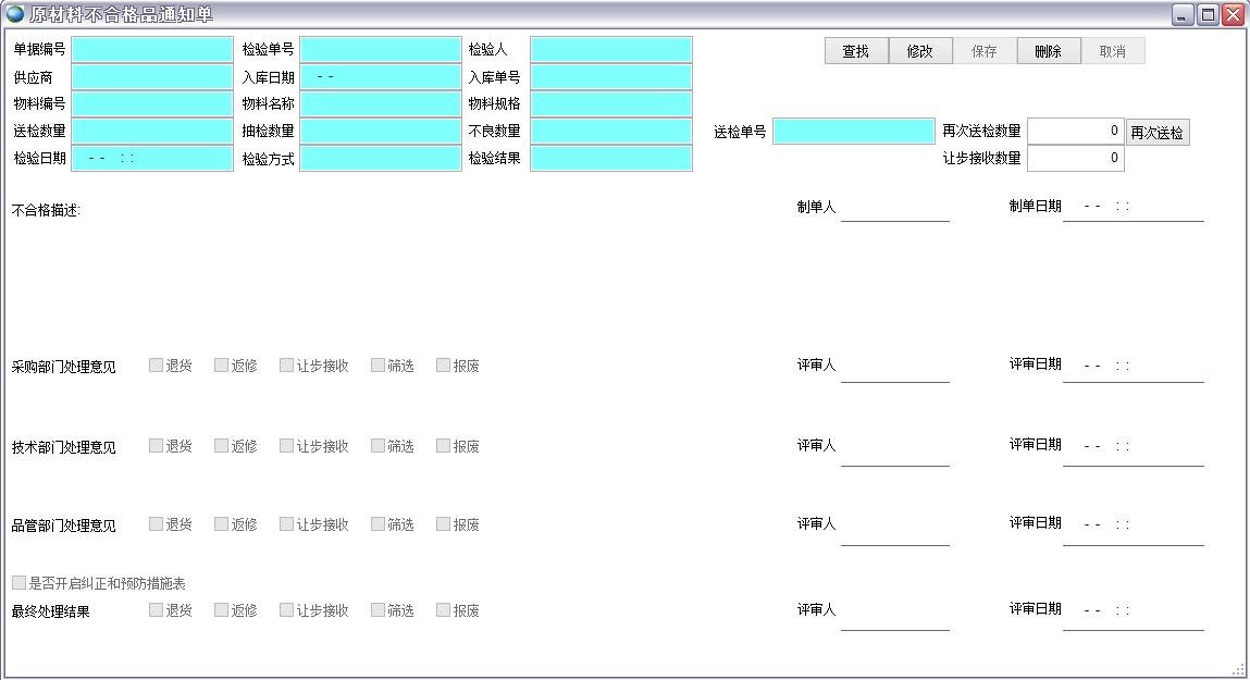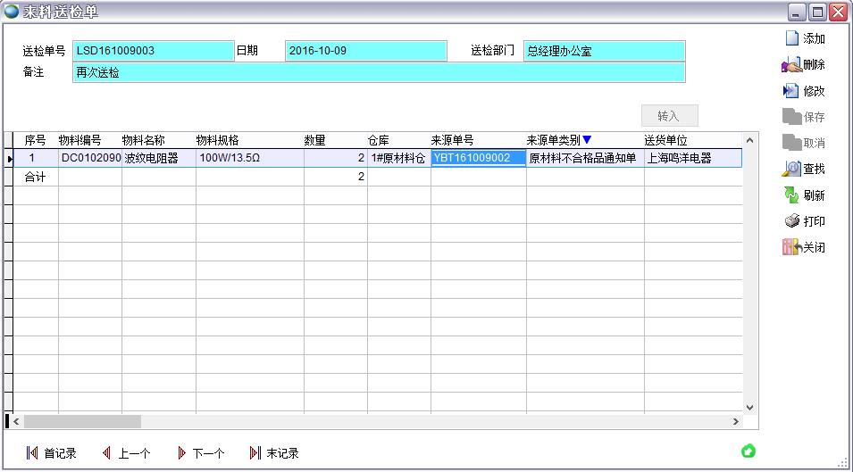 打開路徑:主菜單->質(zhì)量->來料送檢單->原材料不合格品通知單