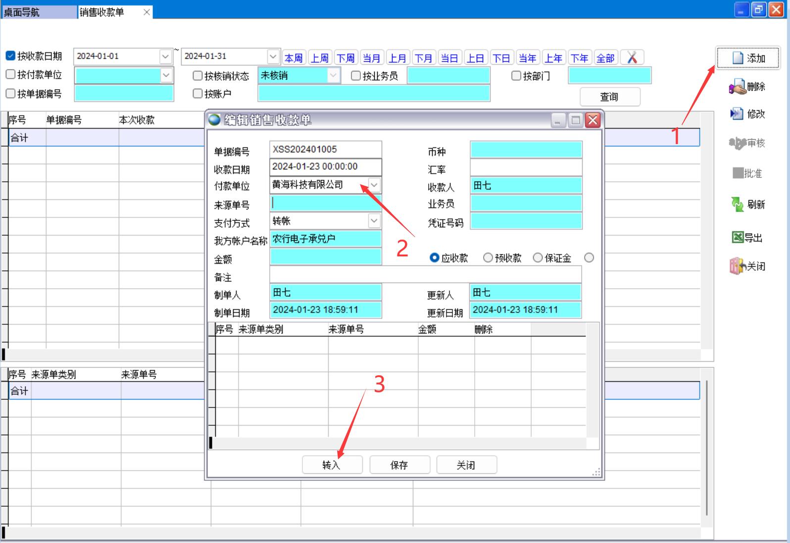 打開路徑:【主菜單】->【應(yīng)收應(yīng)付】 -> 【應(yīng)收】 -> 【銷售收款單】