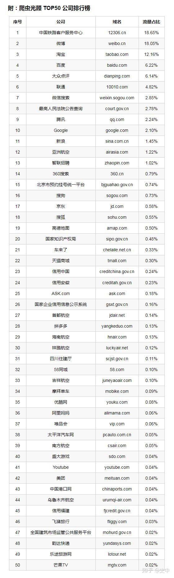 除了剛才這些小模塊,企業(yè)還可以通過 WAF(Web 應用防火墻)來防護,WAF 的功能就是通過設置一些規(guī)則,攔截掉那些不符合規(guī)則的請求。但是,爬蟲的請求,和真人的請求真的太像了。我覺得,對這種戰(zhàn)爭一個形象的比喻就是抗癌。癌細胞的目的就是拼命躲過免疫細胞的識別,而免疫細胞的目標就是拼命分辨哪個是好細胞哪個是癌細胞。在我看來,這場對抗爬蟲的常規(guī)戰(zhàn)眼看就要升級為“智能戰(zhàn)”,而且戰(zhàn)線會向云端轉移。比如騰訊云的 WAF,聽說最近就要通過人工智能的方法來識別爬蟲。這里就不幫他們打廣告了。還有很多其他的云安全廠商,也開始主推反爬蟲的技術。不過,就像人類目前難以消滅癌癥一樣,企業(yè)也難以完全消滅爬蟲。但是我相信,在對抗中這條戰(zhàn)線會達到一個精妙的平衡。這個戰(zhàn)線每向前推進一步,都需要安全研究員付出艱辛的努力。三、《中國焦慮圖鑒》最后,中哥幫你搞到了一張秘密表格。這是被監(jiān)測到的受爬蟲侵擾最多的 Top50。(采樣數據,僅供參考)