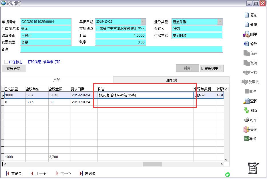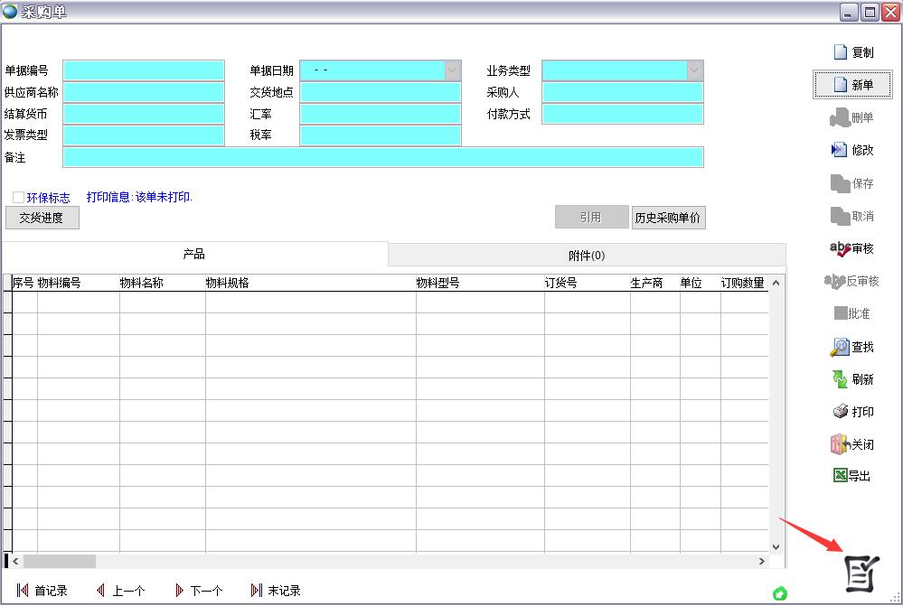 打開路徑:【主菜單】->【采購】-> 【采購單】->【采購單】->右下角