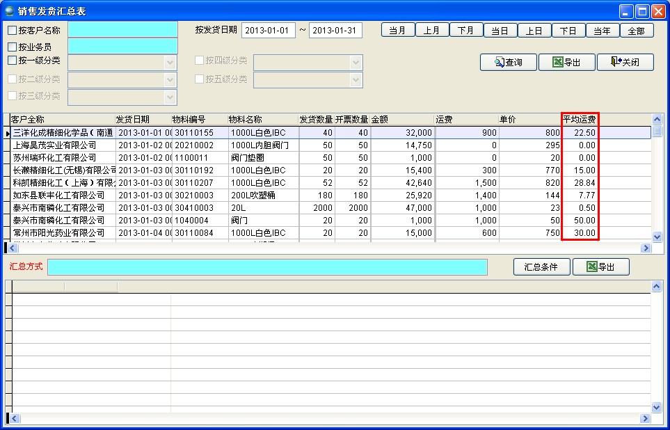 部分單據(jù)會(huì)預(yù)留自由項(xiàng)字段供用戶日后使用。如下圖的銷售發(fā)貨匯總表,出于管理需要我們需要增加一個(gè)字段平均運(yùn)費(fèi),來計(jì)算平均每件貨物所承擔(dān)的運(yùn)費(fèi)。