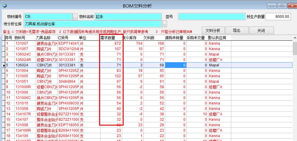 如下圖所示,在進(jìn)行BOM欠料分析時(shí),需求數(shù)量會(huì)存在小數(shù)位,但我們需要向上取整,如實(shí)際需求數(shù)量為1.1時(shí),應(yīng)該取整變成2