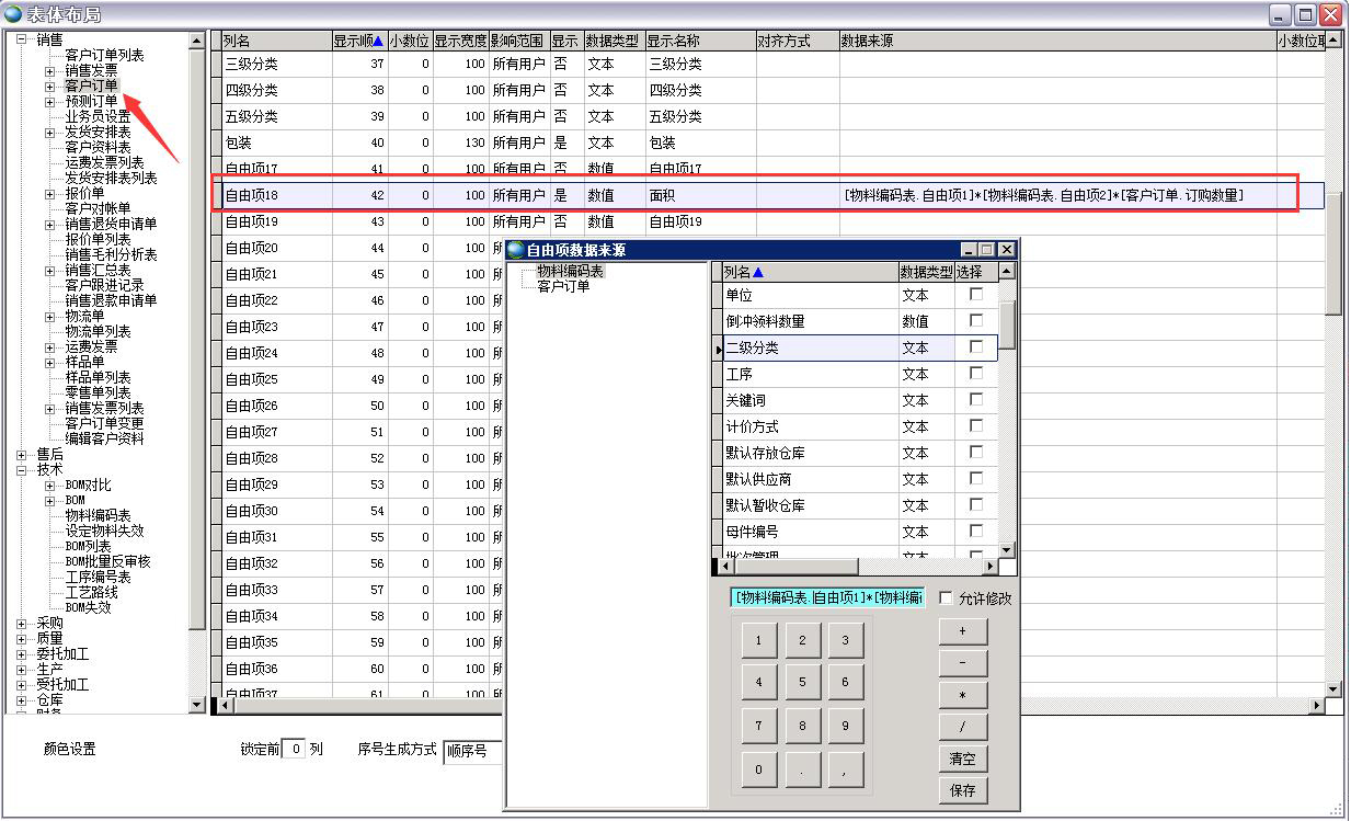 3、在客戶訂單的表體布局中使用自由項(xiàng)1做為長,數(shù)據(jù)來源是物料編碼表的自由項(xiàng)1,自由項(xiàng)2做為寬,數(shù)據(jù)來源是物料編碼表的自由項(xiàng)2,使用自由項(xiàng)18(自由項(xiàng)18的數(shù)據(jù)類型是數(shù)值型)做為面積