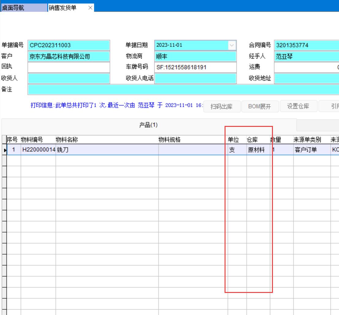 現(xiàn)在改變單位和倉庫的顯示順序,保存表體布局。然后重新打開銷售發(fā)貨單,此時(shí)倉庫的顯示在單位之前。