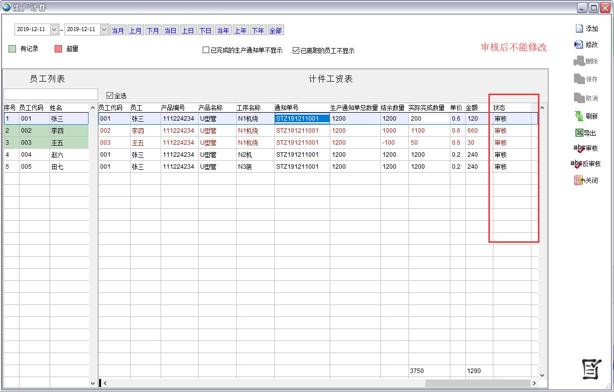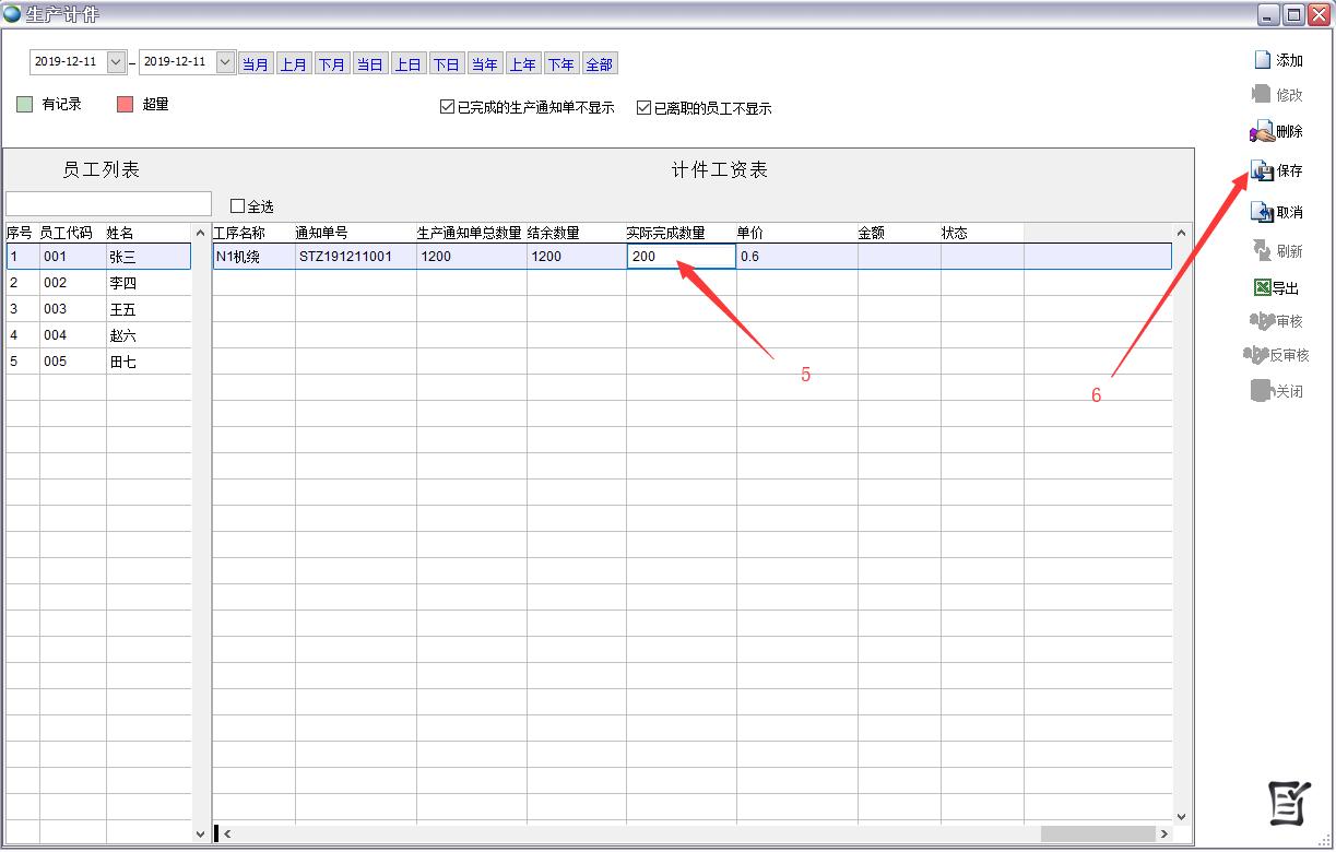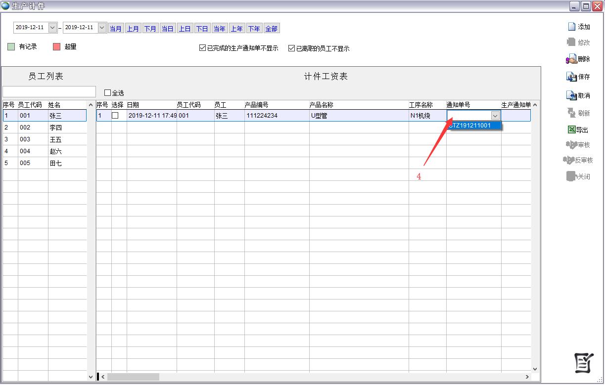 點(diǎn)擊右側(cè)的員工,可以只顯示該員工的生產(chǎn)計(jì)件記錄