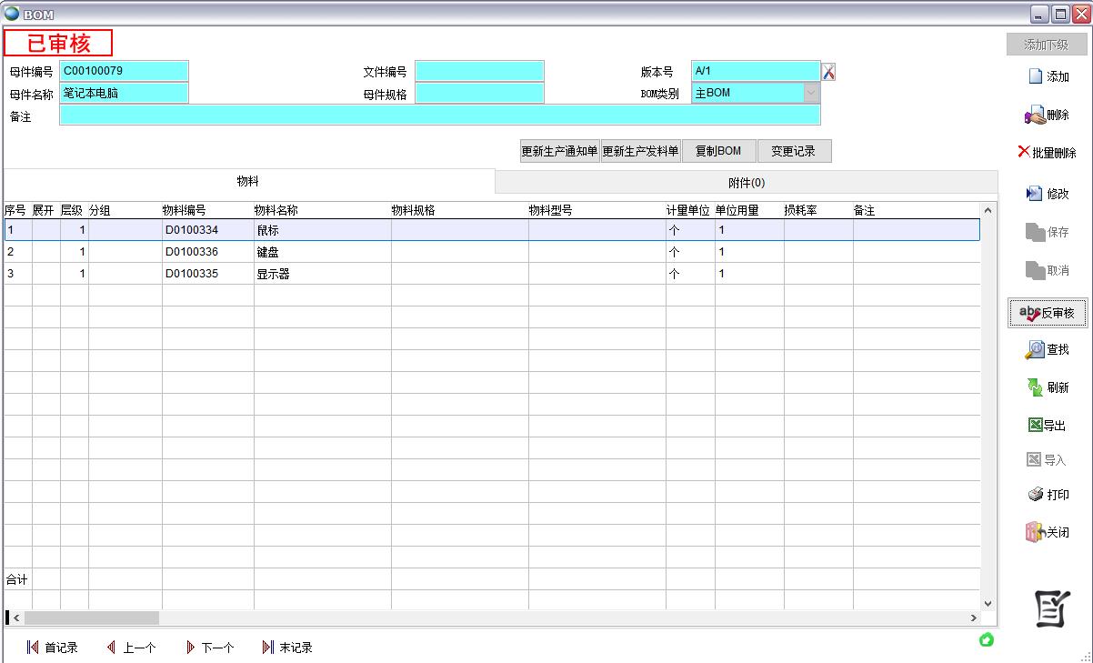 假設(shè)我們的產(chǎn)品是筆記本電腦,筆記本電腦由鍵盤、鼠標(biāo)、顯示器組成,單位用量都是1