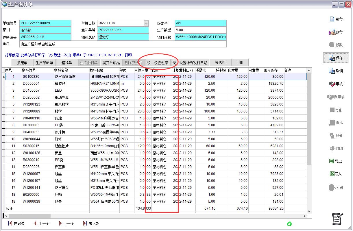 有時候,由于一種產(chǎn)品的物料很多,甚至有上千種物料,而發(fā)料的時候考慮到有些物料都是集中在一個或者幾個倉庫,那么這時候,如果還是每個物料單獨(dú)的去設(shè)置倉庫,那這個工作量就很大,也很浪費(fèi)工作效率,所以我們可以通過統(tǒng)一設(shè)置倉庫的按鍵去統(tǒng)一設(shè)置物料所在的倉庫,十分方便。
