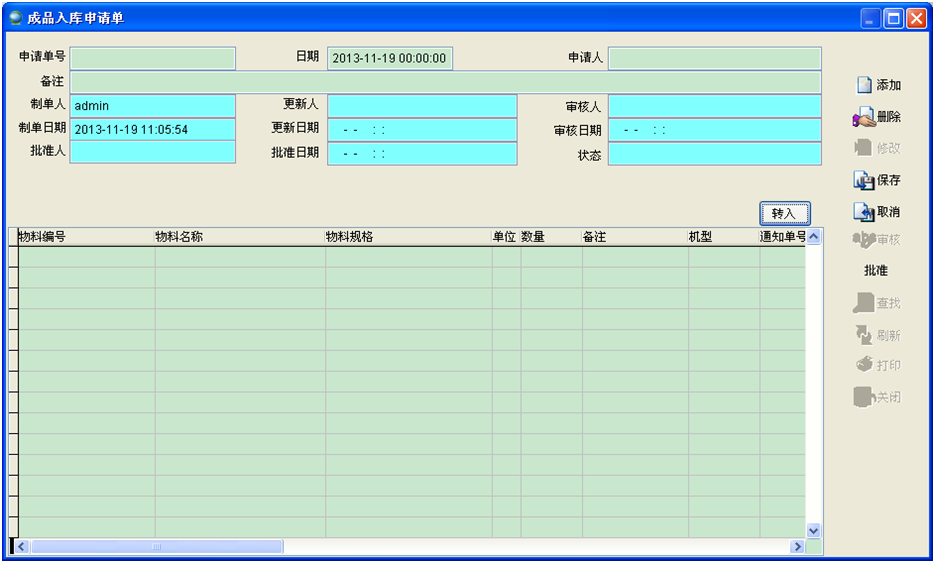 成品入庫申請單可手工錄入,也可以根據(jù)生產(chǎn)通知單生成。點擊轉(zhuǎn)入,出現(xiàn)下面的界面,可以根據(jù)單據(jù)日期、通知單號、部門、機型等四個篩選條件來選擇對應(yīng)的生產(chǎn)通知單,從而生成入庫申請單。需要注意的是,只有已審核的生產(chǎn)通知單才可以轉(zhuǎn)入。