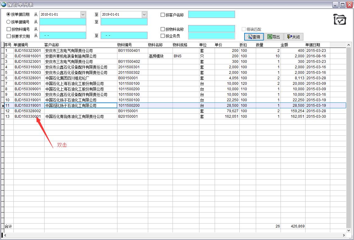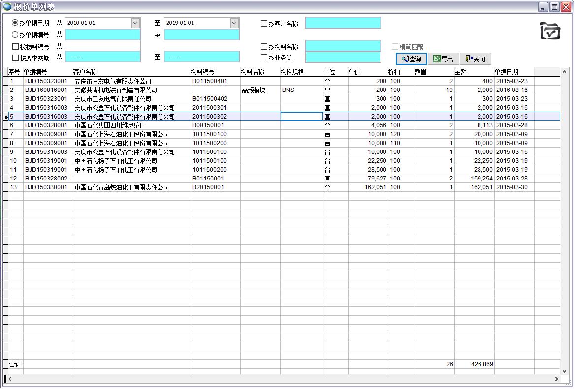 報價單列表是報價單的統(tǒng)計(jì)表,可以按報價單日期、客戶名稱、物料名稱、業(yè)務(wù)員等條件對報價單進(jìn)行統(tǒng)計(jì)。