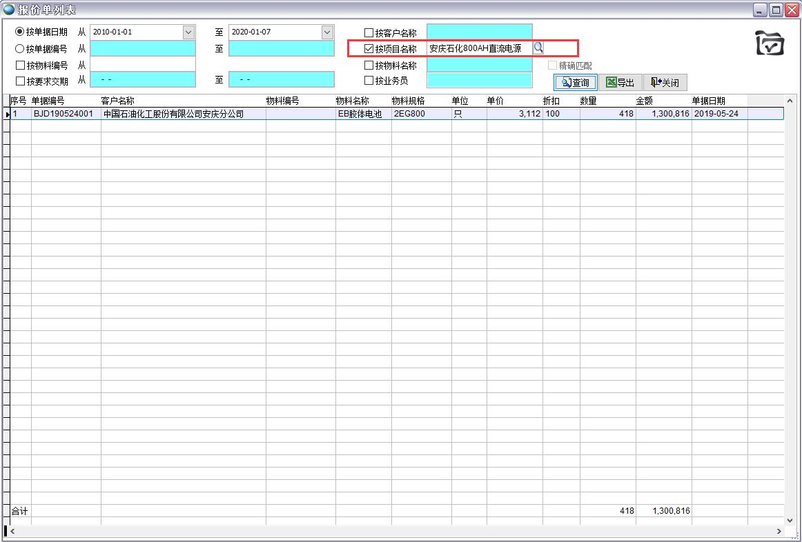 在報價單列表中默認(rèn)是不顯示項(xiàng)目名稱的,需要通過表單布局顯示出來,如下圖按項(xiàng)目名稱查找報價單