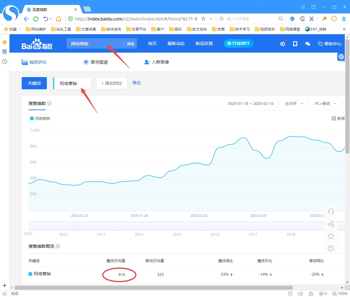 在國內(nèi),百度指數(shù)搜集的關(guān)鍵詞最全面的,可以把要做為標(biāo)題的關(guān)鍵詞在百度指數(shù)中搜索,如果沒有這個(gè)詞就放棄。另外關(guān)鍵詞盡可能日均指數(shù)高,比如本站主關(guān)鍵詞網(wǎng)絡(luò)營銷整體指數(shù)614,可以簡單理解為網(wǎng)絡(luò)營銷一詞每天在百度被搜索614次。