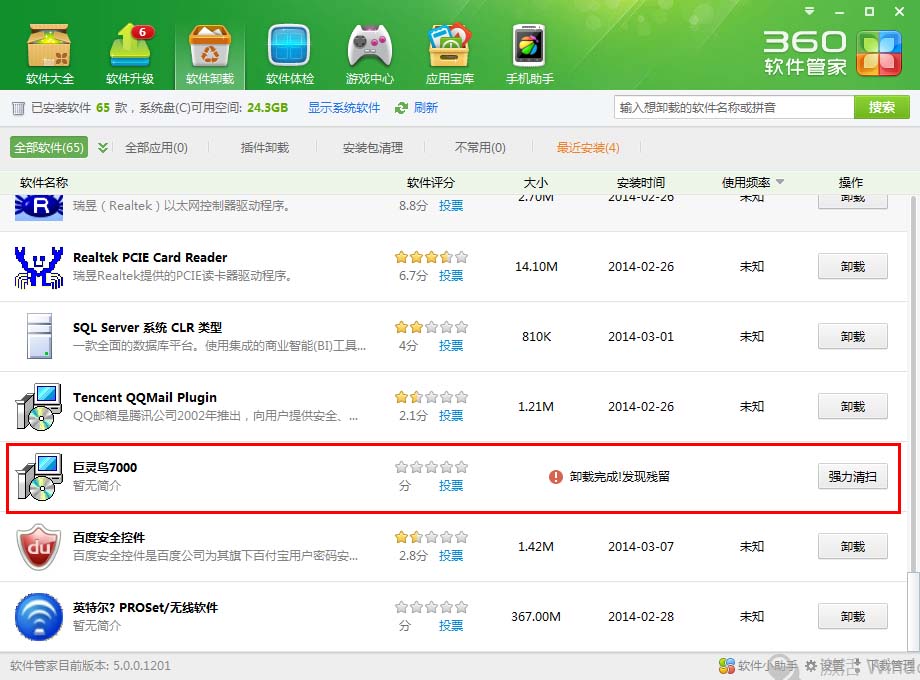 使用專業(yè)軟件卸載工具如360進(jìn)行強(qiáng)力卸載或者清掃注冊(cè)表殘留信息