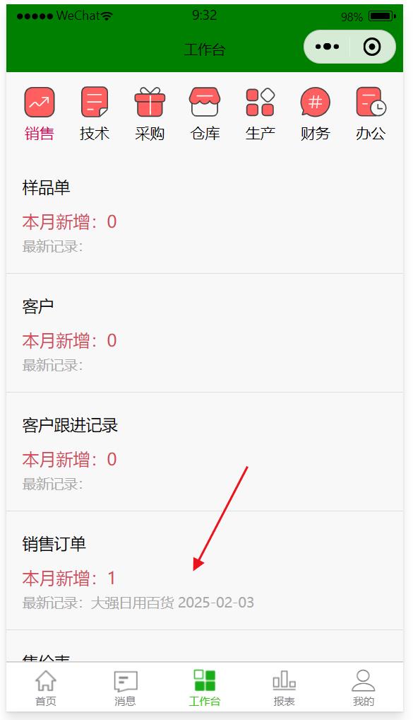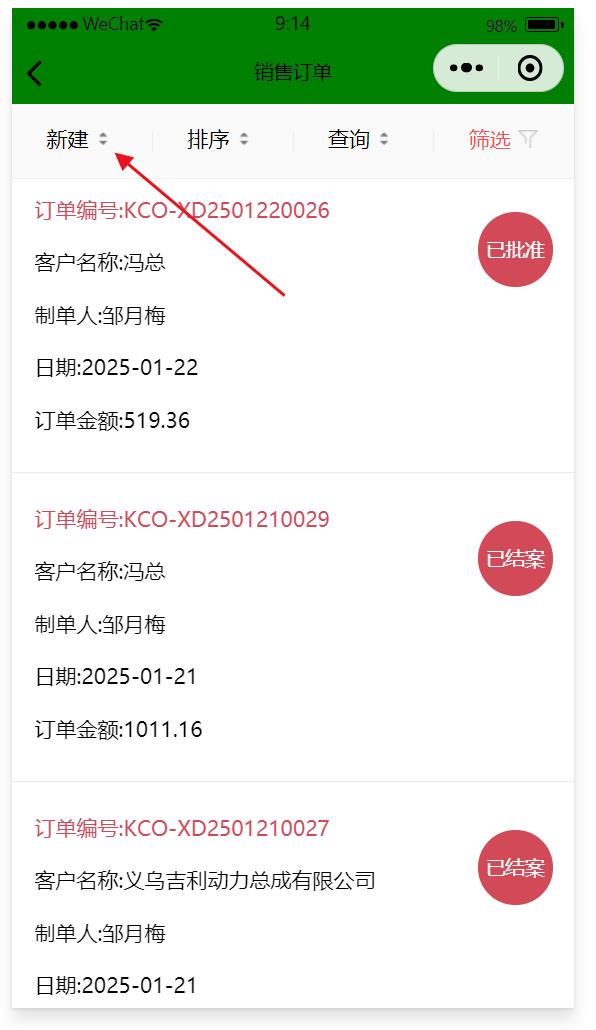 反審批 審批后的單據(jù)不會(huì)出現(xiàn)在待審批記錄中,可以在工作臺(tái)中找到該訂單進(jìn)行反審批 點(diǎn)反審核即可 產(chǎn)品圖片 產(chǎn)品圖片可以從手機(jī)端的商品表中直接上傳,也可以從PC端的物料編碼表中上傳,圖片會(huì)自動(dòng)同步到手機(jī)端 新建 可以通過微信小程序直接做銷售訂單 使用手機(jī)做銷售訂單可以實(shí)現(xiàn)出差在外或異地辦公的人員也能直接下銷售訂單,數(shù)據(jù)會(huì)實(shí)時(shí)同步到PC端,PC端人員在ERP系中繼續(xù)完成該訂單的后續(xù)業(yè)務(wù)。 1、點(diǎn)新建 相關(guān)知識(shí)