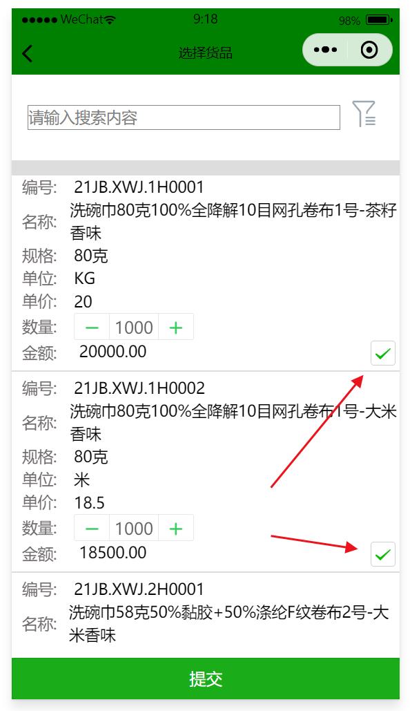 3、選擇貨品,可以按條件篩選貨品,輸入單價(jià)、數(shù)量后點(diǎn)擊選擇框,點(diǎn)提交