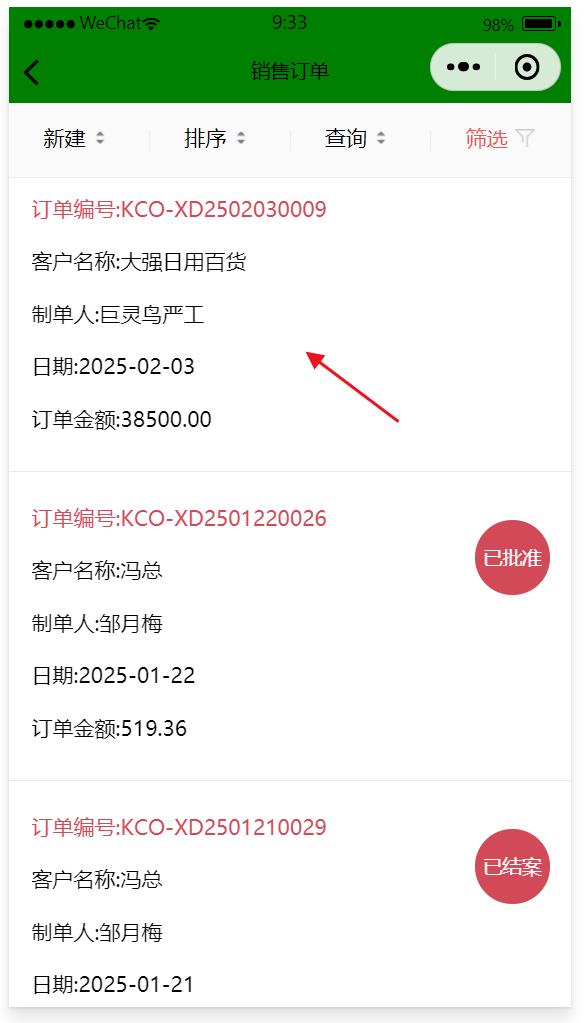 銷售訂單在微信小程序中可以查看、審批、新建,銷售訂單如果是在ERP中建立的,數(shù)據(jù)會(huì)實(shí)時(shí)同步到小程序中