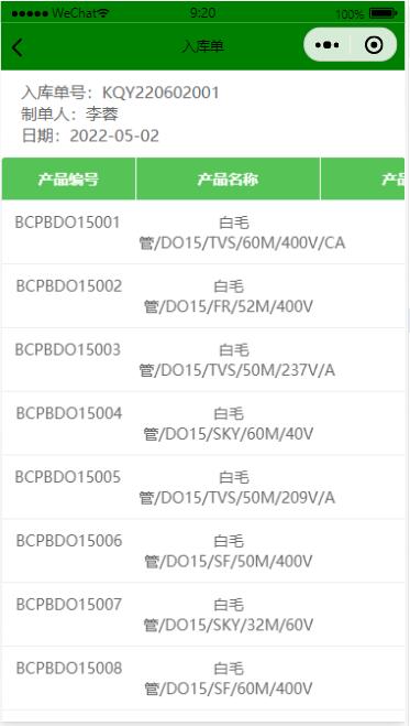 入庫單對(duì)應(yīng)ERP中的各種入庫單,如采購入庫單、成品入庫單、其它入庫單、庫存調(diào)整單等,數(shù)據(jù)在ERP中錄入,同步到微信小程序端