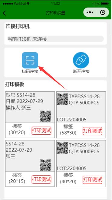 首次使用需要先連接藍(lán)牙打印機(jī),點(diǎn)擊掃碼連接