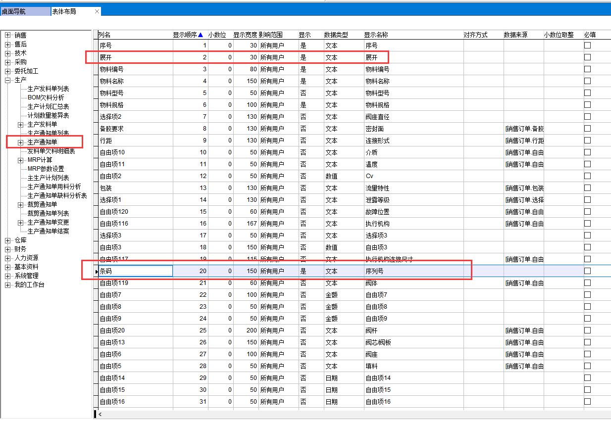 表體布局中將序列號字段顯示出來,默認(rèn)為不顯示