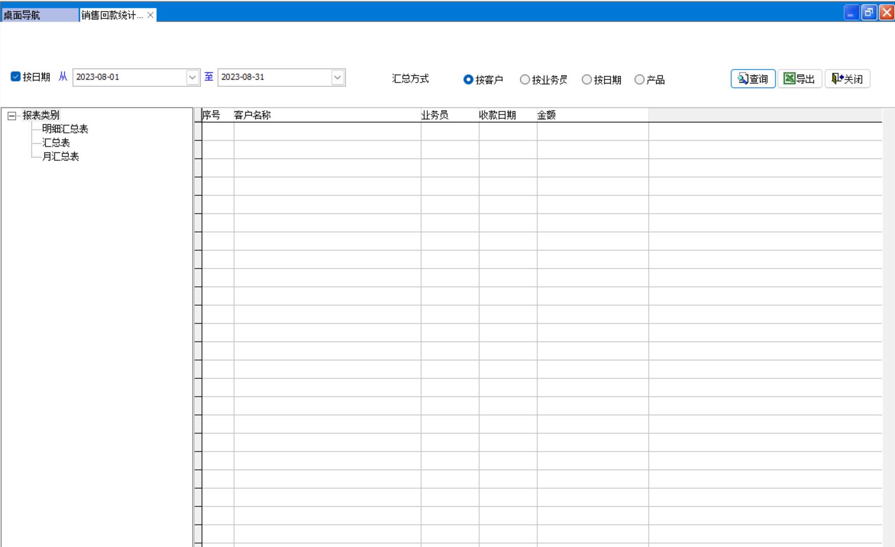 打開路徑:【主菜單】-【銷售】-【報表】 -【銷售回款統(tǒng)計表】