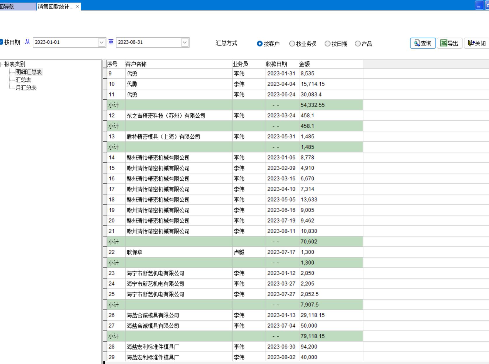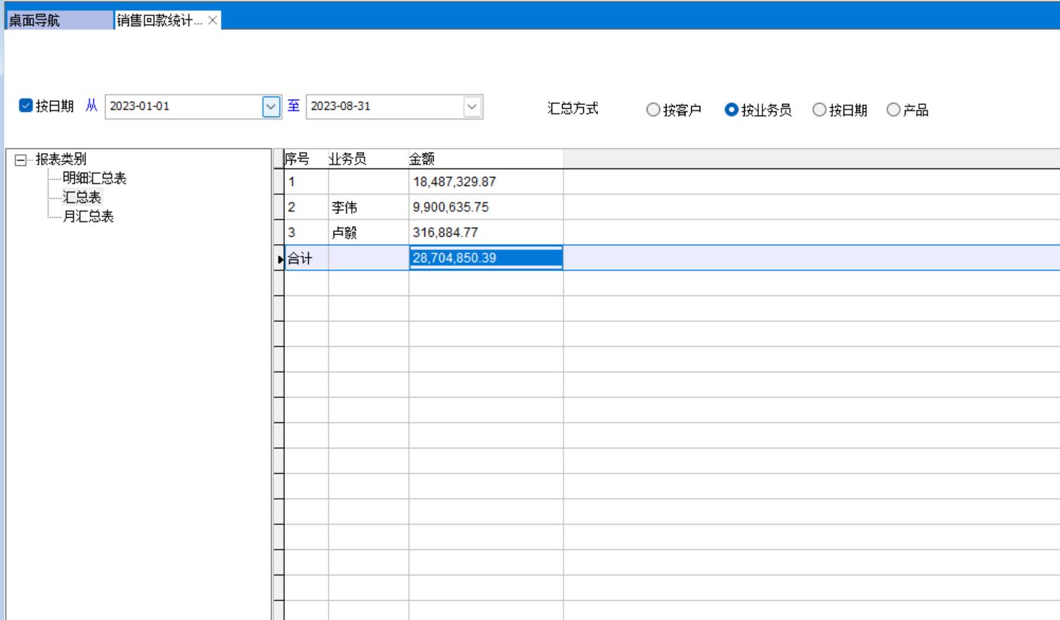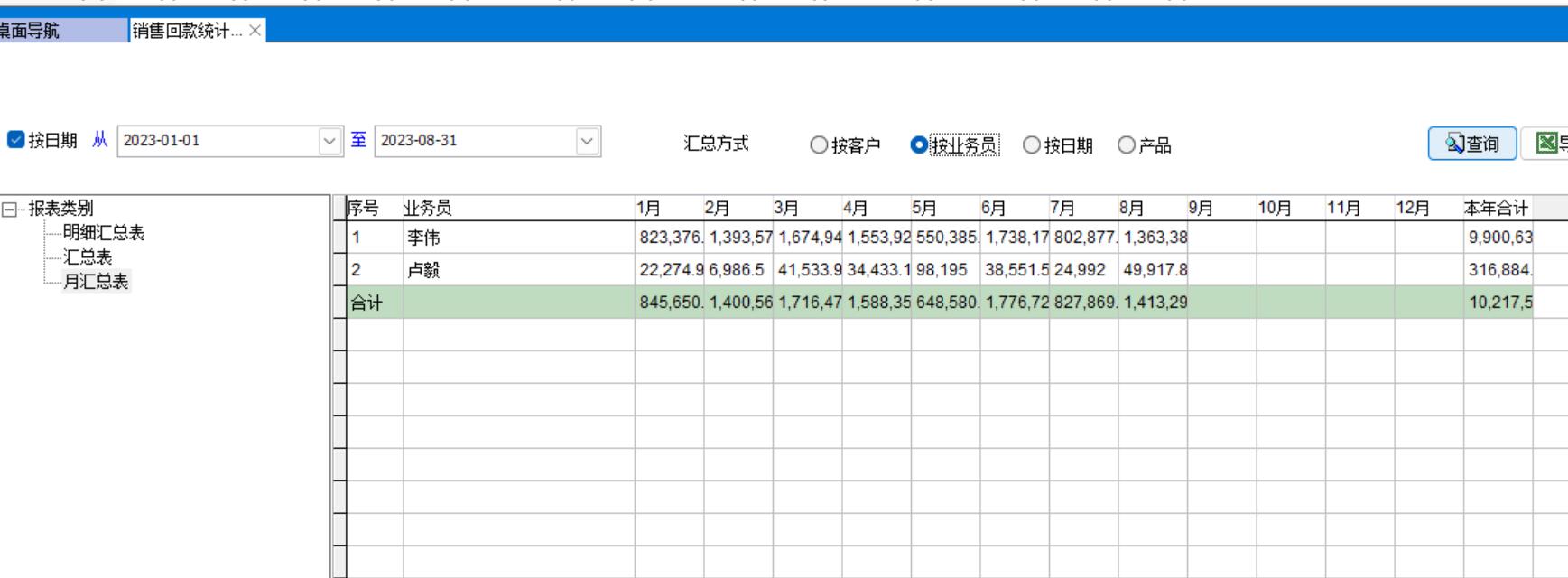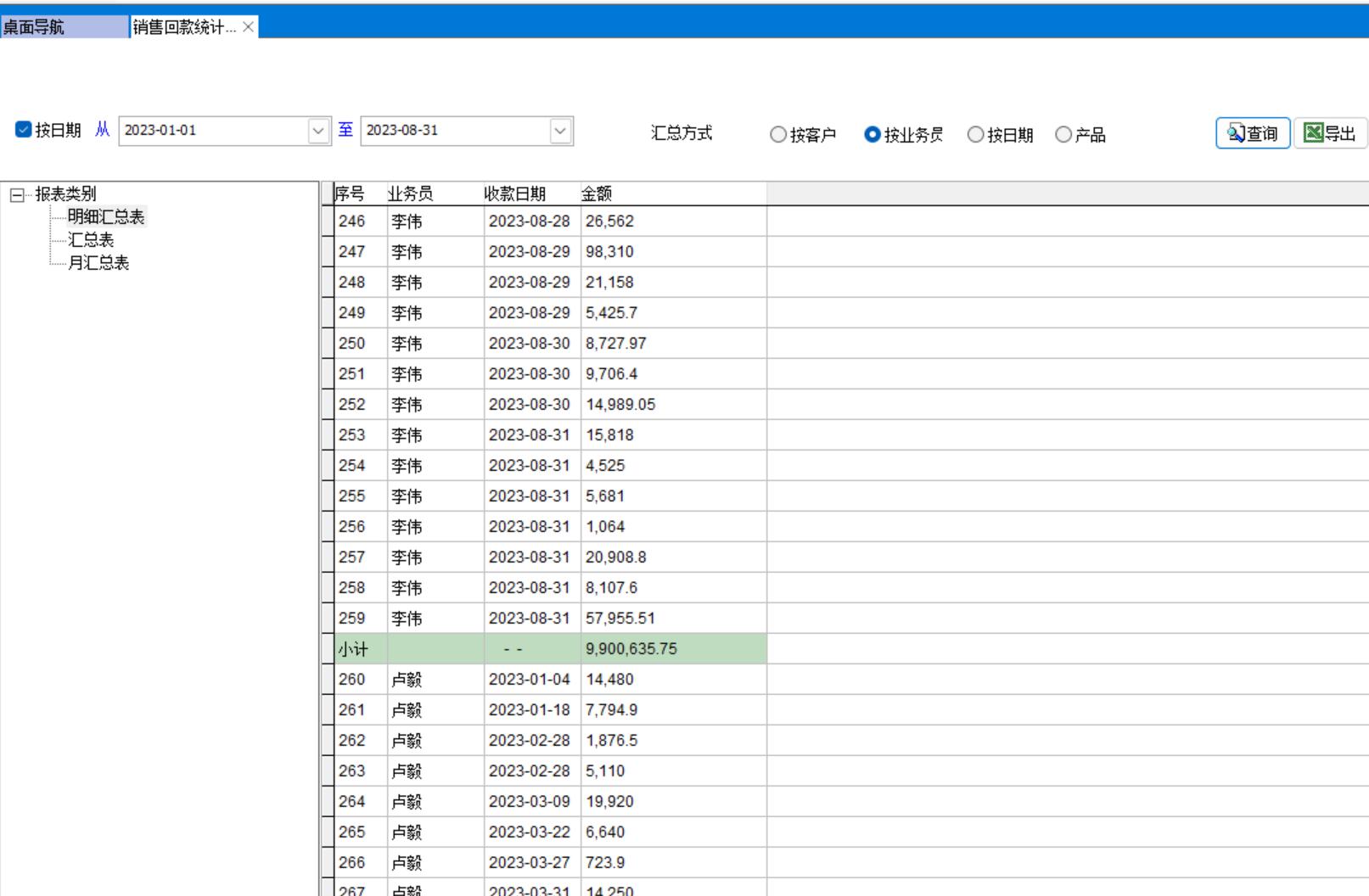 2、按業(yè)務員收款明細匯總