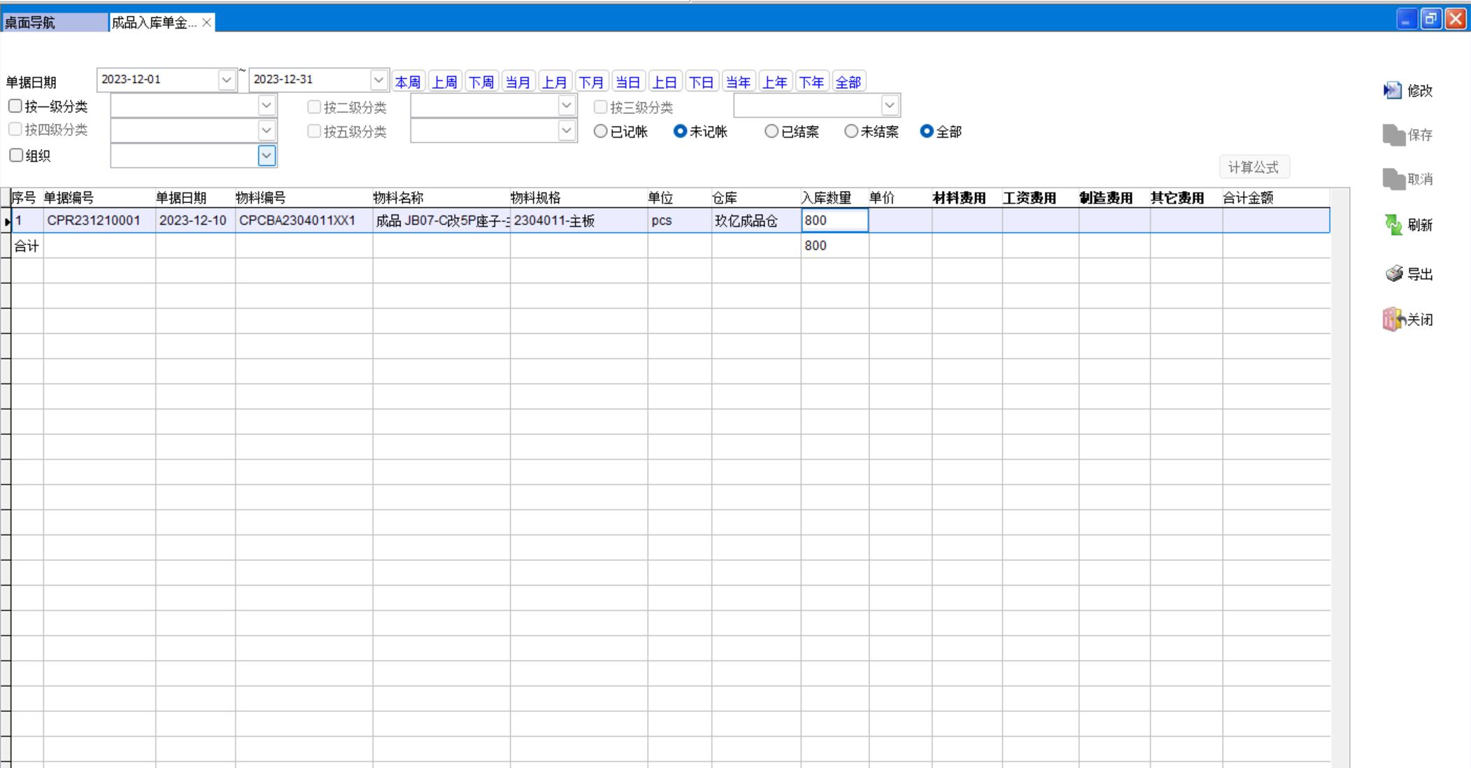 打開路徑:【主菜單】-【存貨核算】-【成品入庫單金額維護】