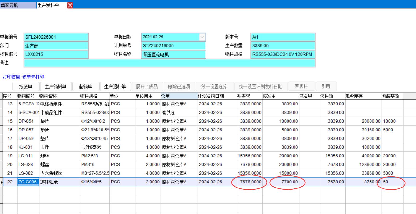 生產(chǎn)實(shí)際需求數(shù)量是7678個,但是系統(tǒng)會按50的整數(shù)倍計算得出應(yīng)發(fā)數(shù)量7700,倉庫實(shí)際發(fā)給車間7700個,剩余22個就在車間,系統(tǒng)在下個生產(chǎn)發(fā)料單時會先扣除這22個再計算還要給車間領(lǐng)多少料。